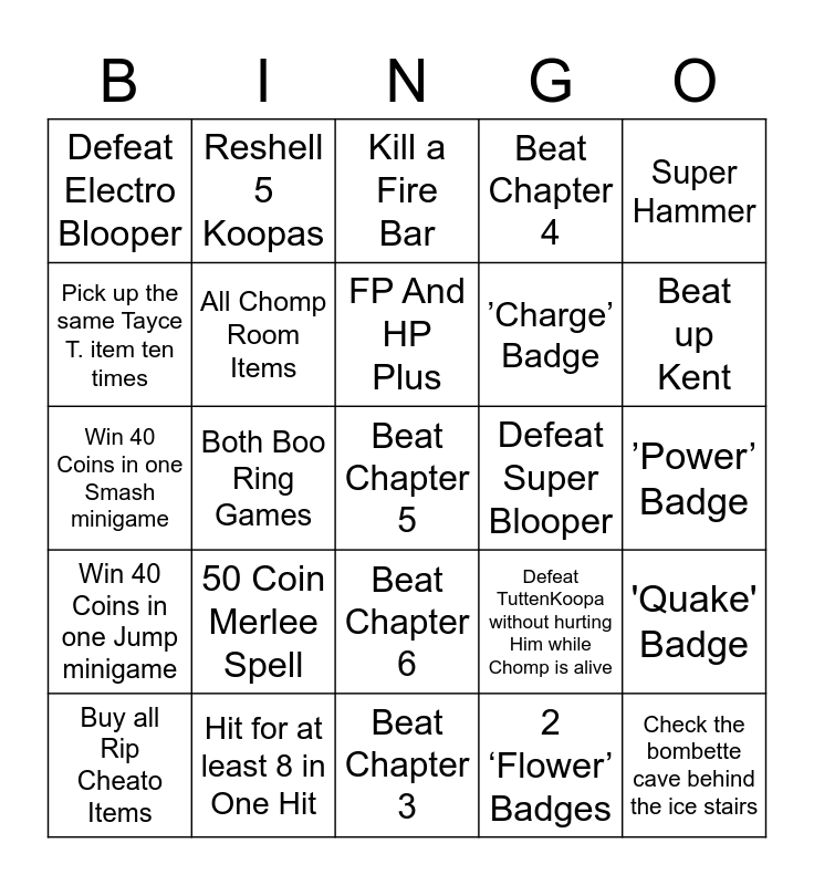 This bingo card has 25 words: 50 Coin Merlee Spell, Beat Chapter 3, FP And HP Plus, Buy all Rip Cheato Items, Super Hammer, Defeat Electro Blooper, Pick up the same Tayce T. item ten times, Reshell 5 Koopas, Defeat Super Blooper, Beat Chapter 6, ’Charge’ Badge, Win 40 Coins in one Smash minigame, Defeat TuttenKoopa without hurting Him while Chomp is alive, 'Quake' Badge, All Chomp Room Items, Check the bombette cave behind the ice stairs, ’Power’ Badge, Kill a Fire Bar, Beat up Kent, Both Boo Ring Games, Beat Chapter 5, Hit for at least 8 in One Hit, Win 40 Coins in one Jump minigame, Beat Chapter 4 and 2 ‘Flower’ Badges.
