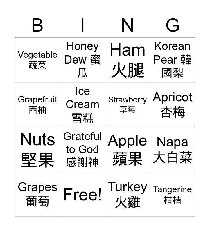 This bingo card has 22 words: Free!, Nectarine 油桃, Honey Dew 蜜瓜, Squash 瓜, Ice Cream 雪糕, Strawberry 草莓, Vegetable 蔬菜, Ham 火腿, Apple 蘋果, Tangerine 柑桔, Nuts 堅果, Korean Pear 韓國梨, Kiwi 奇異果, Iceberg Lettuce 生菜, Turkey 火雞, Vine Tomato 帶莖番茄, Napa 大白菜, Grapes 葡萄, Grateful to God 感謝神, Grapefruit 西柚, Apricot 杏梅 and Navel Orange 橙.