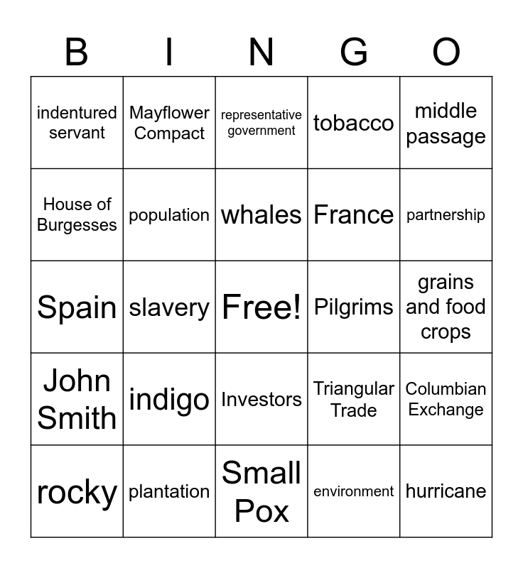 This bingo card has a free space and 24 words: indigo, plantation, whales, rocky, middle passage, indentured servant, House of Burgesses, Mayflower Compact, Pilgrims, Investors, France, Spain, Triangular Trade, Columbian Exchange, population, environment, grains and food crops, representative government, partnership, slavery, hurricane, John Smith, tobacco and Small Pox.
