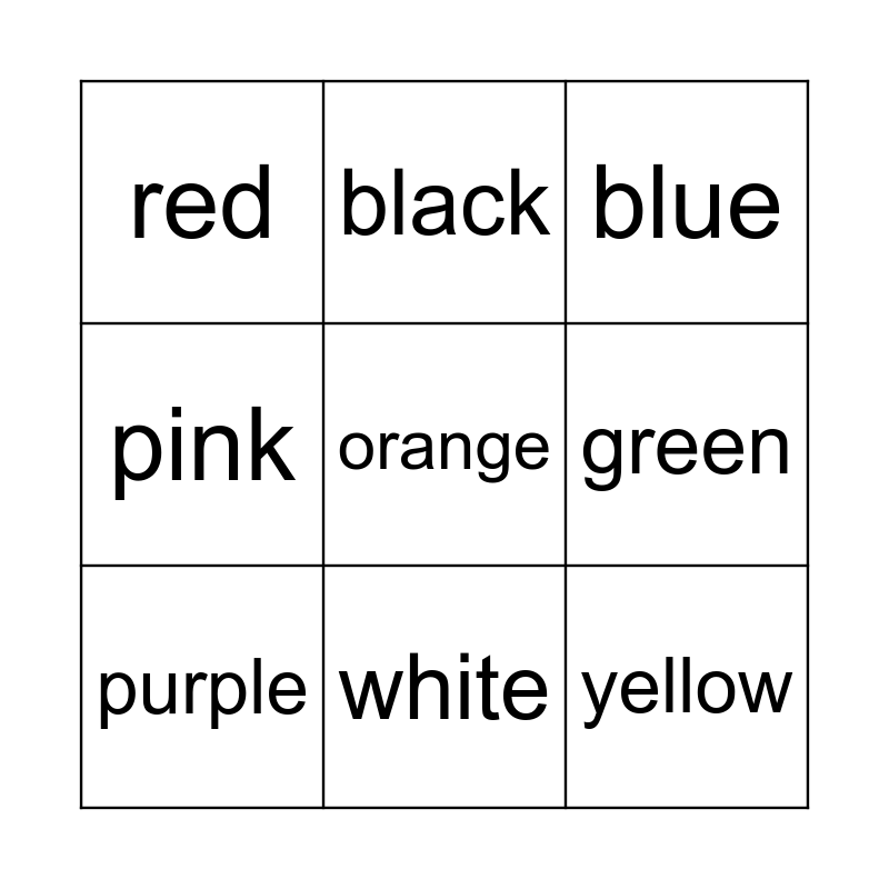 This bingo card has 9 words: purple, blue, black, pink, red, green, orange, yellow and white.