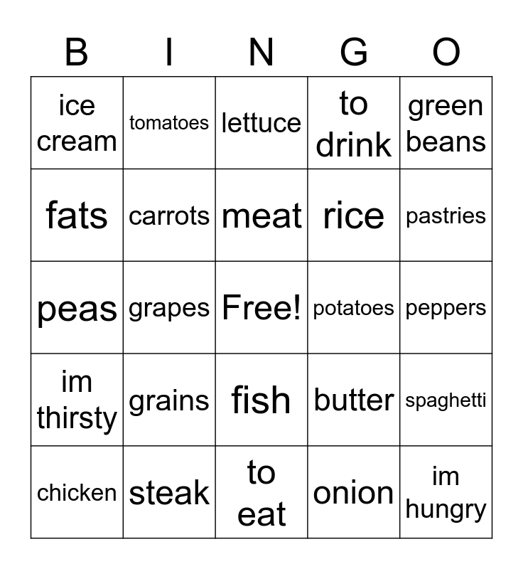 This bingo card has a free space and 24 words: grains, steak, meat, chicken, green beans, ice cream, fats, tomatoes, potatoes, fish, rice, peas, butter, spaghetti, carrots, onion, peppers, lettuce, pastries, grapes, im hungry, im thirsty, to drink and to eat.
