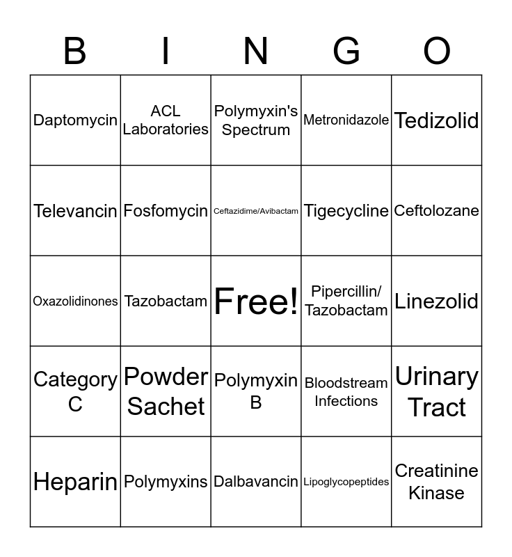 This bingo card has a free space and 24 words: Powder Sachet, Polymyxins, Ceftazidime/Avibactam, Heparin, Tedizolid, Daptomycin, Televancin, ACL Laboratories, Pipercillin/ Tazobactam, Polymyxin B, Tigecycline, Oxazolidinones, Bloodstream Infections, Urinary Tract, Fosfomycin, Lipoglycopeptides, Linezolid, Polymyxin's Spectrum, Ceftolozane, Tazobactam, Creatinine Kinase, Category C, Metronidazole and Dalbavancin.