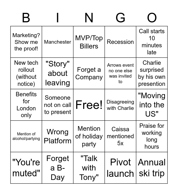 This bingo card has a free space and 24 words: Wrong Platform, Forget a B-Day, Forget a Company, "You're muted", Call starts 10 minutes late, Marketing? Show me the proof!, New tech rollout (without notice), Manchester, Disagreeing with Charlie, Mention of holiday party, Arrows event no one else was invited to, Benefits for London only, Caissa mentioned 5x, Praise for working long hours, "Story" about leaving, Pivot launch, "Moving into the US", MVP/Top Billers, Charlie surprised by his own presention, Someone not on call to present, Annual ski trip, Mention of alcohol/partying, Recession and "Talk with Tony".