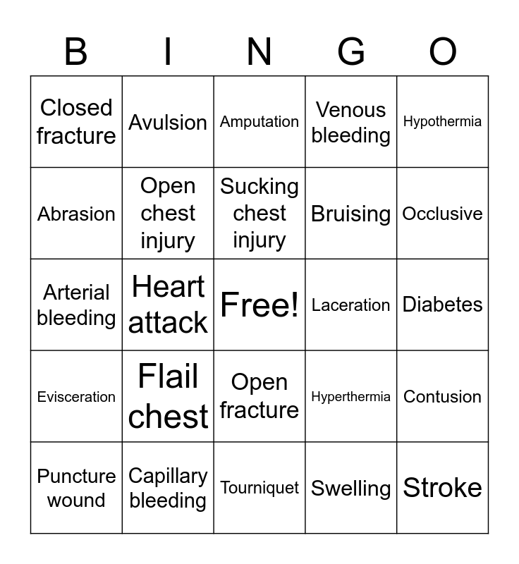 This bingo card has a free space and 28 words: Contusion, Hematoma, Bruising, Swelling, Abrasion, Amputation, Avulsion, Evisceration, Laceration, Puncture wound, Arterial bleeding, Venous bleeding, Capillary bleeding, Tourniquet, Occlusive, Closed chest injury, Flail chest, Open chest injury, Sucking chest injury, Open fracture, Closed fracture, Dislocation, Stroke, Heart attack, Diabetes, Hyperthermia, Hypothermia and Frost bite.