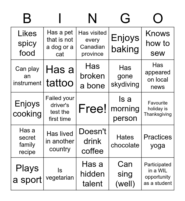 This bingo card has a free space and 24 words: Has lived in another country, Is vegetarian, Has broken a bone, Plays a sport, Knows how to sew, Likes spicy food, Can play an instrument, Has a pet that is not a dog or a cat, Is a morning person, Doesn't drink coffee, Has gone skydiving, Enjoys cooking, Hates chocolate, Practices yoga, Has a tattoo, Can sing (well), Favourite holiday is Thanksgiving, Has visited every Canadian province, Has appeared on local news, Failed your driver's test the first time, Participated in a WIL opportunity as a student, Has a secret family recipe, Enjoys baking and Has a hidden talent.