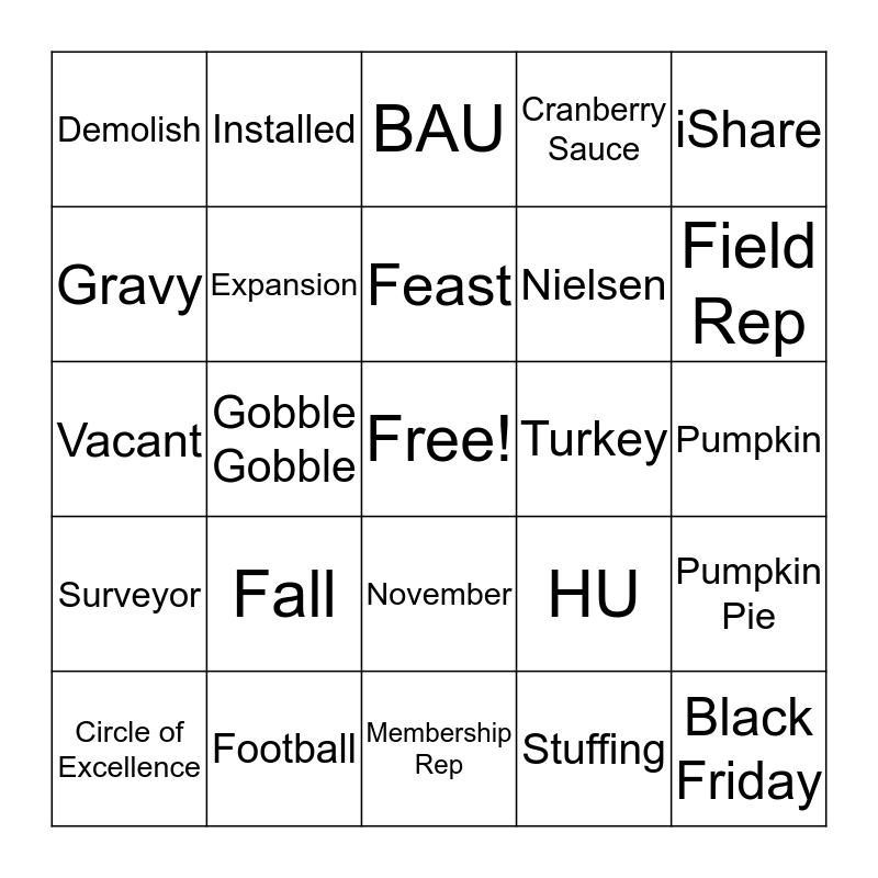 This bingo card has a free space and 24 words: Fall, Football, Feast, Circle of Excellence, iShare, Demolish, Gravy, Installed, Turkey, November, Nielsen, Vacant, HU, Pumpkin Pie, Expansion, Stuffing, Pumpkin, BAU, Field Rep, Gobble Gobble, Black Friday, Surveyor, Cranberry Sauce and Membership Rep.