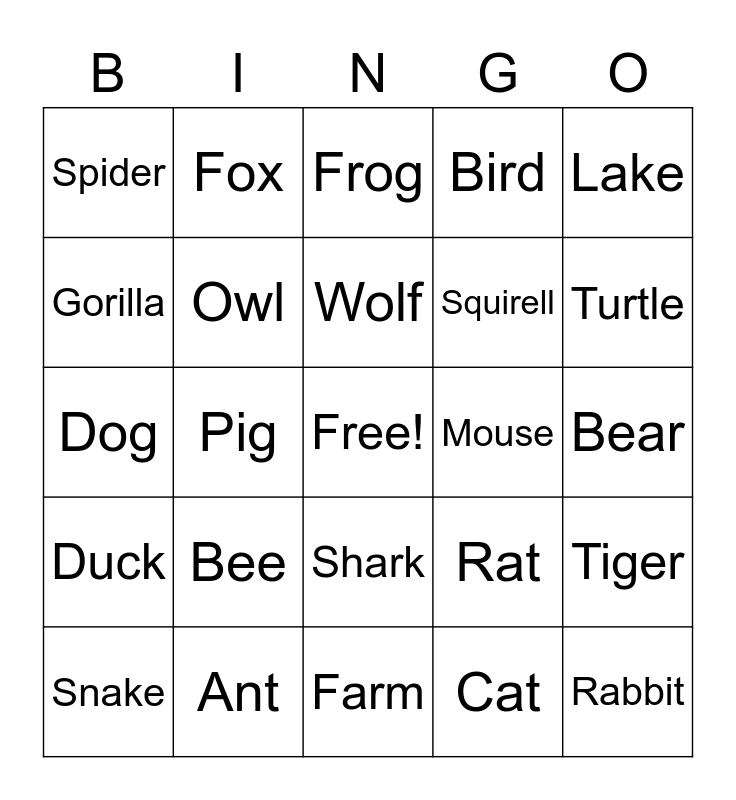 This bingo card has a free space and 24 words: Bee, Ant, Wolf, Snake, Lake, Spider, Gorilla, Fox, Mouse, Shark, Squirell, Dog, Rat, Tiger, Owl, Cat, Bear, Frog, Turtle, Pig, Rabbit, Duck, Bird and Farm.