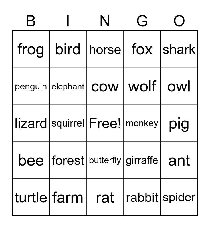 This bingo card has a free space and 24 words: forest, farm, cow, turtle, shark, frog, penguin, bird, monkey, butterfly, wolf, lizard, girraffe, ant, elephant, rabbit, pig, horse, owl, squirrel, spider, bee, fox and rat.
