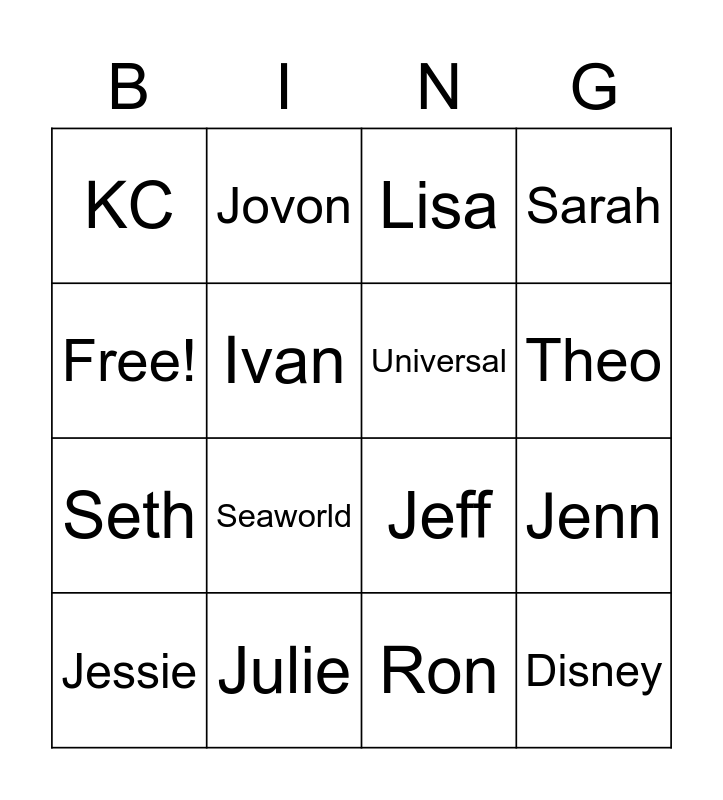 This bingo card has 16 words: Julie, Jenn, Lisa, KC, Seth, Jovon, Jeff, Ron, Free!, Ivan, Jessie, Sarah, Seaworld, Theo, Universal and Disney.