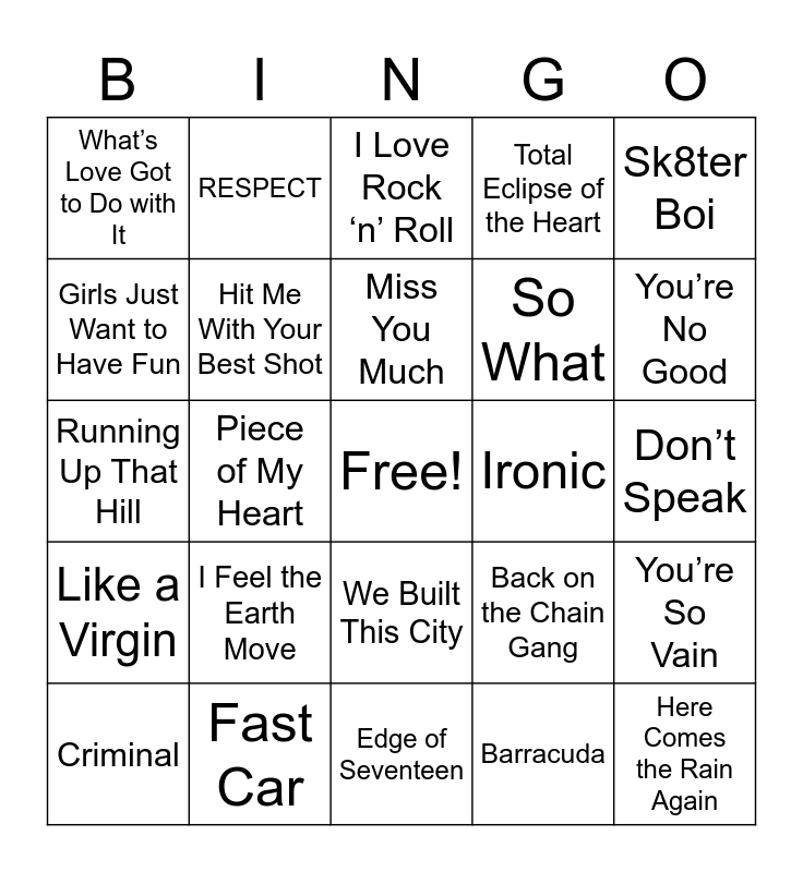 This bingo card has a free space and 31 words: Edge of Seventeen, Because the Night, Piece of My Heart, Rapture, What’s Love Got to Do with It, I Love Rock ‘n’ Roll, Hit Me With Your Best Shot, Back on the Chain Gang, Ironic, Barracuda, Don’t Speak, Here Comes the Rain Again, Come to My Window, All I Wanna Do, You’re No Good, Kiss Me Deadly, You’re So Vain, I Feel the Earth Move, Like a Virgin, We Built This City, Sk8ter Boi, Bring Me to Life, Criminal, RESPECT, So What, Girls Just Want to Have Fun, Total Eclipse of the Heart, Running Up That Hill, Fast Car, Miss You Much and Call Me.