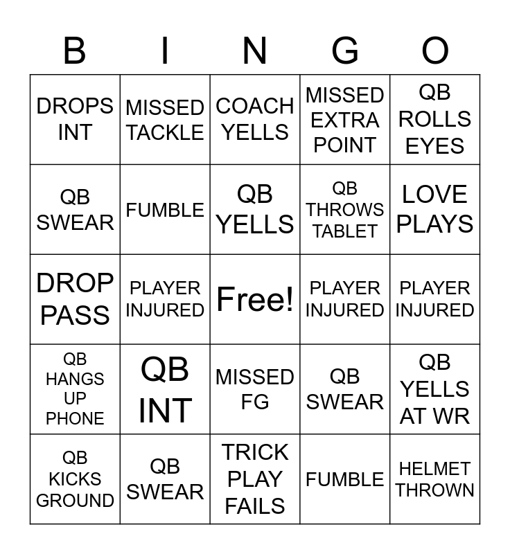 This bingo card has a free space and 24 words: QB INT, QB SWEAR, QB YELLS, QB KICKS GROUND, QB ROLLS EYES, DROPS INT, QB SWEAR, MISSED TACKLE, PLAYER INJURED, MISSED FG, QB THROWS TABLET, DROP PASS, QB SWEAR, QB YELLS AT WR, FUMBLE, FUMBLE, PLAYER INJURED, COACH YELLS, LOVE PLAYS, PLAYER INJURED, HELMET THROWN, QB HANGS UP PHONE, MISSED EXTRA POINT and TRICK PLAY FAILS.