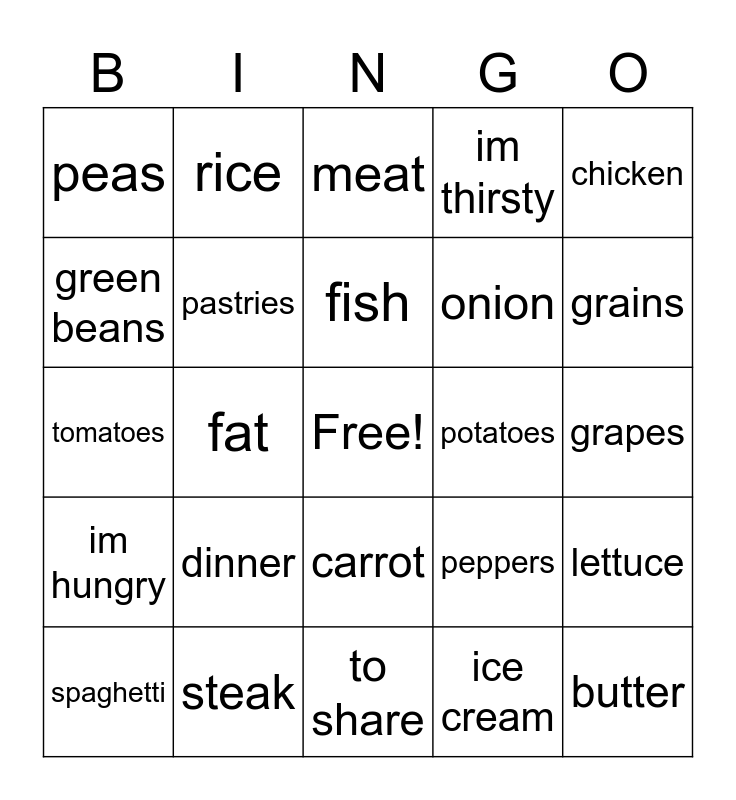 This bingo card has a free space and 24 words: dinner, steak, fish, spaghetti, chicken, peas, green beans, rice, potatoes, carrot, onion, tomatoes, peppers, lettuce, pastries, ice cream, grapes, meat, grains, fat, butter, im hungry, im thirsty and to share.