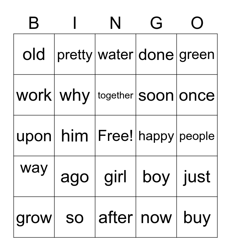 This bingo card has a free space and 34 words: away, now, some, today, way, why, green, grow, pretty, should, together, water, any, from, happy, once, so, upon, ago, boy, girl, how, old, people, after, buy, done, every, soon, work, as, him, just and think.