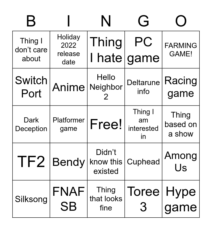 This bingo card has a free space and 24 words: Bendy, FNAF SB, Hello Neighbor 2, Silksong, FARMING GAME!, Thing I don’t care about, Switch Port, Holiday 2022 release date, Thing I am interested in, Didn’t know this existed, Deltarune info, Dark Deception, Cuphead, Among Us, Anime, Toree 3, Thing based on a show, Thing I hate, Racing game, Platformer game, Hype game, TF2, PC game and Thing that looks fine.