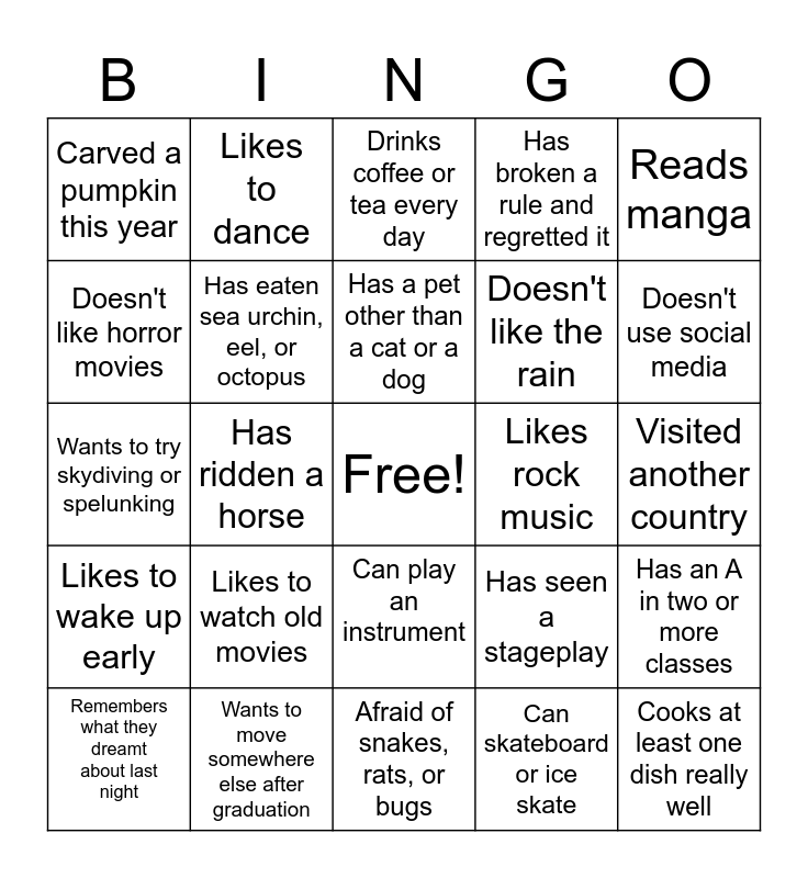 This bingo card has a free space and 24 words: Likes to watch old movies, Wants to move somewhere else after graduation, Has a pet other than a cat or a dog, Remembers what they dreamt about last night, Reads manga, Carved a pumpkin this year, Doesn't like horror movies, Likes to dance, Likes rock music, Can play an instrument, Doesn't like the rain, Wants to try skydiving or spelunking, Has seen a stageplay, Has an A in two or more classes, Has eaten sea urchin, eel, or octopus, Can skateboard or ice skate, Visited another country, Drinks coffee or tea every day, Doesn't use social media, Has ridden a horse, Cooks at least one dish really well, Likes to wake up early, Has broken a rule and regretted it and Afraid of snakes, rats, or bugs.