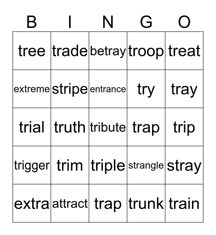 This bingo card has 25 words: trim, trap, entrance, extra, treat, tree, extreme, trade, trap, triple, try, trial, strangle, stray, stripe, train, trip, betray, tray, truth, tribute, attract, trigger, troop and trunk.