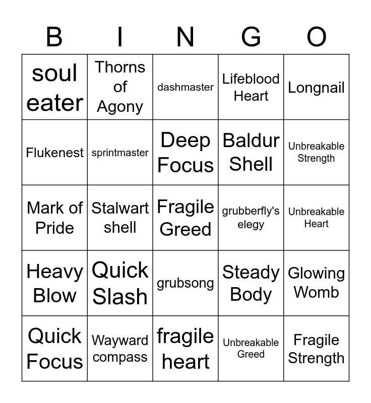 This bingo card has 30 words: Wayward compass, Gatherign swarm, Stalwart shell, shaman stone, soul eater, dashmaster, sprintmaster, grubsong, grubberfly's elegy, fragile heart, Unbreakable Heart, Fragile Greed, Unbreakable Greed, Fragile Strength, Unbreakable Strength, Spell Twister, Steady Body, Heavy Blow, Quick Slash, Longnail, Mark of Pride, Fury of the Fallen, Thorns of Agony, Baldur Shell, Flukenest, Lifeblood Heart, Glowing Womb, Quick Focus, Deep Focus and Lifeblood Core.