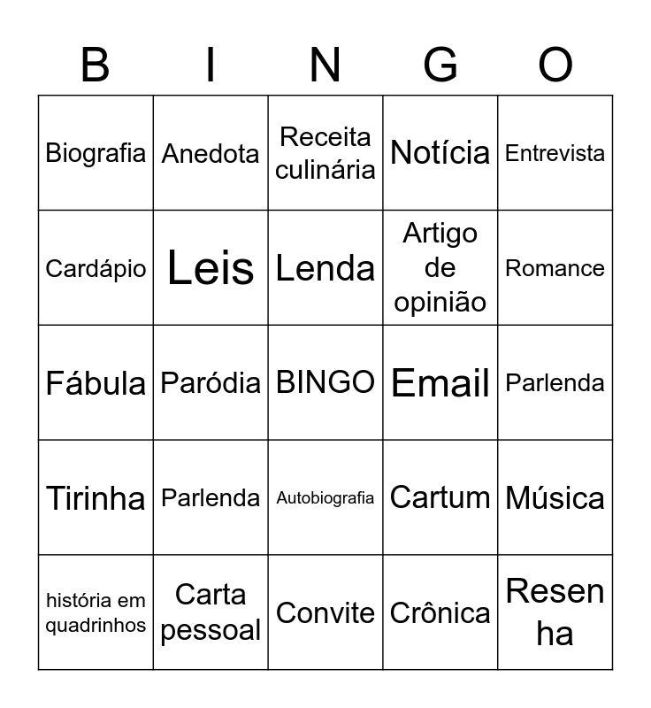 This bingo card has a free space and 34 words: Cartum, Crônica, Conto, Peça teatral, Tirinha, Leis, Entrevista, história em quadrinhos, Anedota, Charge, Lenda, Receita culinária, Reportagem, Bilhete, Email, Romance, Carta pessoal, Fábula, Parlenda, Cartum, Autobiografia, Propaganda, Biografia, Parlenda, Convite, Resen ha, Notícia, Entrevista, Artigo de opinião, Cardápio, Cartão-postal, Paródia, Música and Anedota.