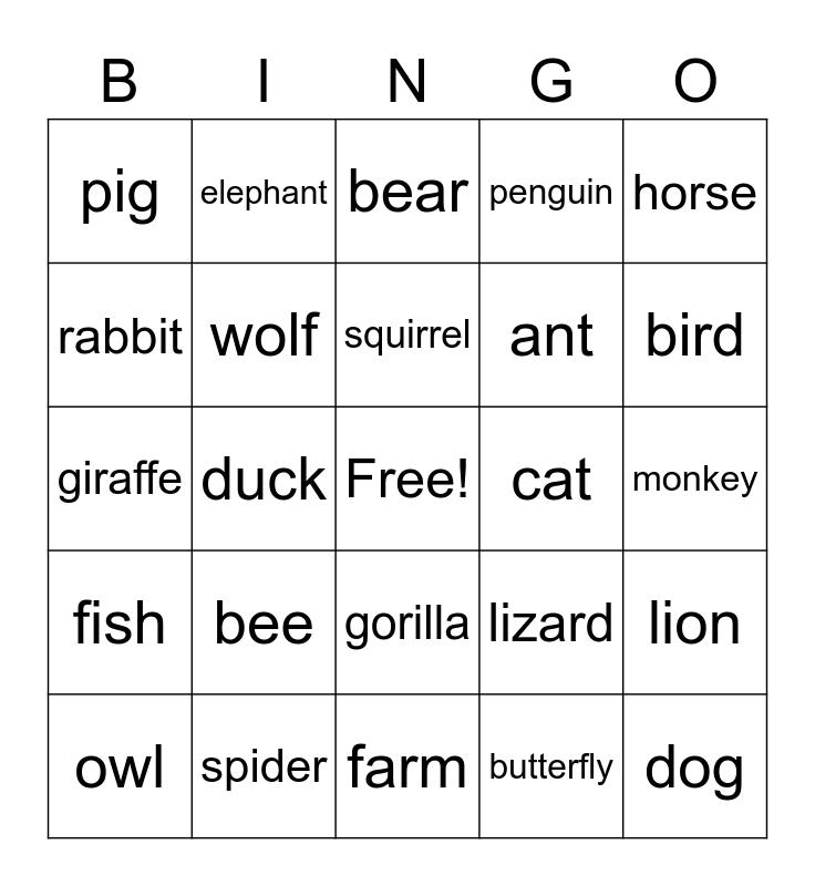 This bingo card has a free space and 24 words: bee, spider, squirrel, owl, horse, pig, rabbit, elephant, cat, gorilla, ant, giraffe, lizard, lion, wolf, butterfly, monkey, bear, bird, duck, dog, fish, penguin and farm.