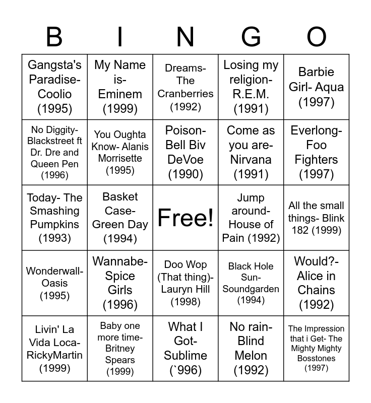 This bingo card has a free space and 24 words: Wannabe- Spice Girls (1996), Baby one more time- Britney Spears (1999), Poison- Bell Biv DeVoe (1990), Livin' La Vida Loca- RickyMartin (1999), Barbie Girl- Aqua (1997), Gangsta's Paradise- Coolio (1995), No Diggity- Blackstreet ft Dr. Dre and Queen Pen (1996), My Name is- Eminem (1999), Jump around- House of Pain (1992), Doo Wop (That thing)- Lauryn Hill (1998), Come as you are- Nirvana (1991), Today- The Smashing Pumpkins (1993), Black Hole Sun- Soundgarden (1994), Would?- Alice in Chains (1992), You Oughta Know- Alanis Morrisette (1995), No rain- Blind Melon (1992), All the small things- Blink 182 (1999), Dreams- The Cranberries (1992), Everlong- Foo Fighters (1997), Basket Case- Green Day (1994), The Impression that i Get- The Mighty Mighty Bosstones (1997), Wonderwall- Oasis (1995), Losing my religion- R.E.M. (1991) and What I Got- Sublime (`996).