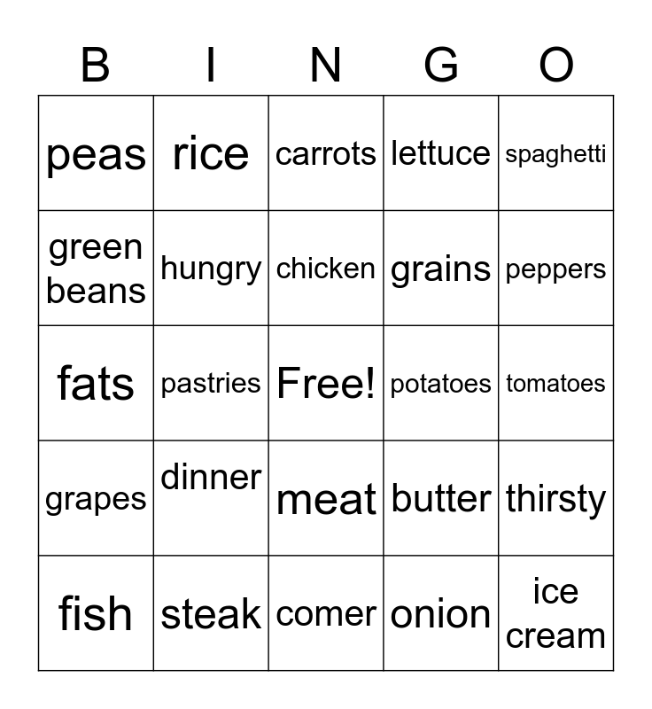 This bingo card has a free space and 24 words: dinner, steak, chicken, fish, spaghetti, peas, green beans, rice, potatoes, meat, grains, fats, butter, thirsty, hungry, onion, tomatoes, carrots, peppers, pastries, ice cream, grapes, lettuce and comer.