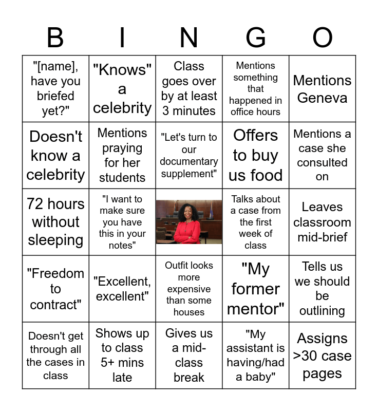 This bingo card has a free space and 24 words: "Excellent, excellent", Shows up to class 5+ mins late, "Let's turn to our documentary supplement", Doesn't get through all the cases in class, Mentions Geneva, "[name], have you briefed yet?", Doesn't know a celebrity, "Knows" a celebrity, Talks about a case from the first week of class, Outfit looks more expensive than some houses, Offers to buy us food, 72 hours without sleeping, "My former mentor", Tells us we should be outlining, Mentions praying for her students, "My assistant is having/had a baby", Leaves classroom mid-brief, Class goes over by at least 3 minutes, Mentions a case she consulted on, "I want to make sure you have this in your notes", Assigns >30 case pages, "Freedom to contract", Mentions something that happened in office hours and Gives us a mid-class break.