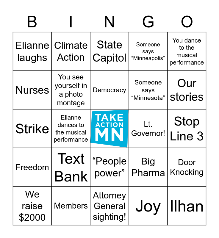 This bingo card has a free space and 55 words: Elianne takes a sip of water, We raise $2000, We raise $5000, Elianne laughs, Attorney General sighting!, State legislator sighting!, You see yourself in a photo montage, GOTV, Someone says “Minnesota”, Someone says “St. Paul", Someone says “Minneapolis”, “Duluth”, “Water Protectors”, You see someone you know, You laugh, Elianne mentions “snacks”, You dance to the musical performance, Elianne dances to the musical performance, Greater Minnesota, Ilhan, Lt. Governor!, People’s Action, Big Pharma, State Capitol, Medicare for All, Democracy, Joy, Members, Stop Line 3, Door Knocking, Our Stories, House Party, Union, Teachers, Nurses, Strike, Democracy, Freedom, Reproductive Rights, Abortion Access, Climate Action, Green New Deal, Door Knock, Phone Bank, Text Bank, Members, Student debt, Greater MN, Minneapolis, Our stories, Conversations, “I’m/we’re clear”, “Multiracial gender-inclusive democracy”, “People power” and “Community safety".