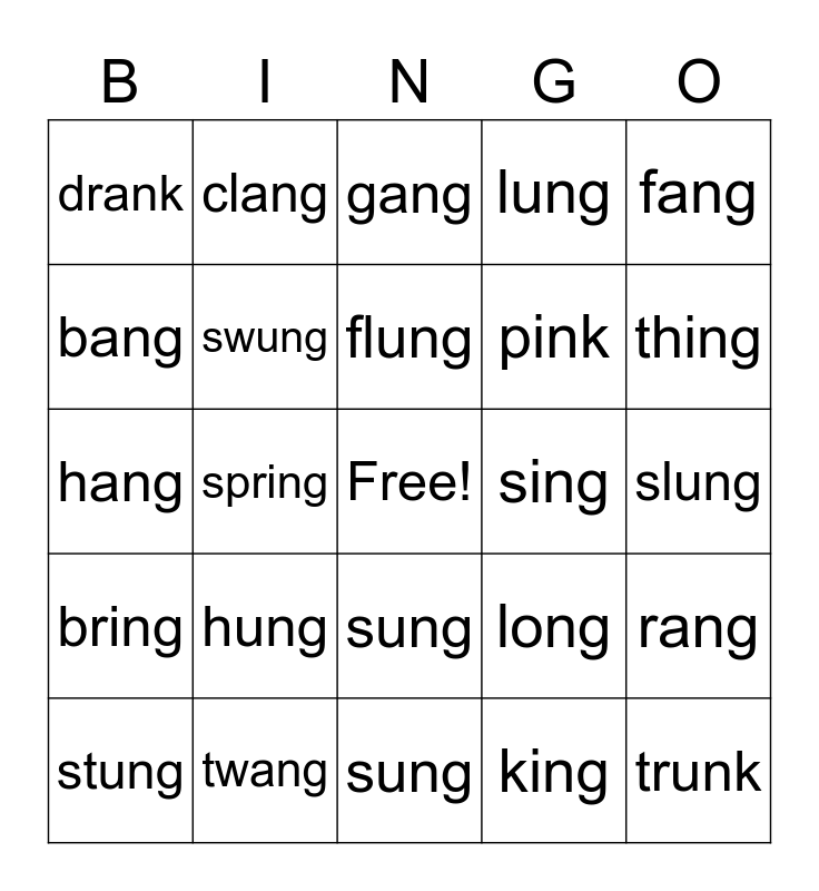This bingo card has a free space and 39 words: wing, swing, strong, long, rang, bring, spring, sting, sing, slung, bang, clang, ping, thing, hang, hung, sung, lung, gong, stung, swung, flung, king, fang, sprang, twang, sung, strong, prong, drank, thank, sunk, pink, trunk, along, fling, gang, thing and string.