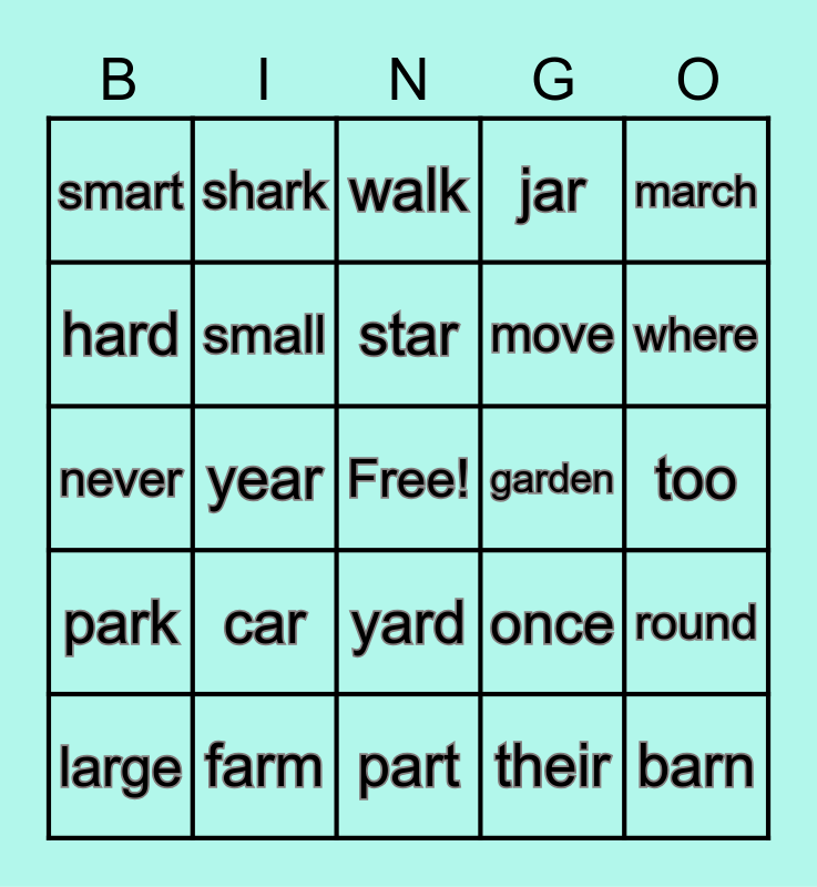 This bingo card has a free space and 24 words: car, farm, star, large, march, smart, hard, shark, garden, yard, move, never, once, round, small, their, too, walk, where, year, barn, park, jar and part.