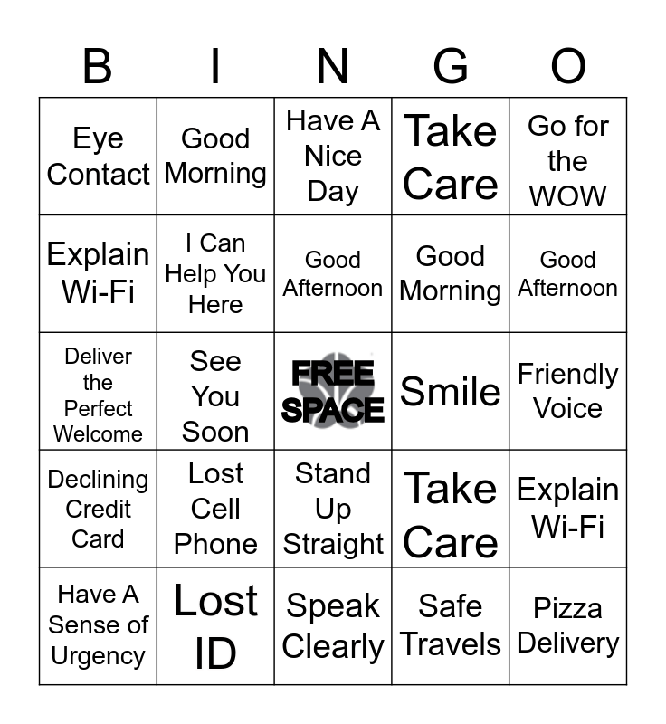 This bingo card has a free space and 29 words: Have A Sense of Urgency, Be Polite, See You Soon, Welcome, Eye Contact, Have A Nice Day, I Can Help You Here, Lost Cell Phone, Smile, Lost ID, Friendly Voice, Pizza Delivery, Speak Clearly, Safe Travels, Good Afternoon, Acknowledge Select Guests, Stand Up Straight, Declining Credit Card, Go for the WOW, Deliver the Perfect Welcome, Take Care, See You Soon, Good Morning, Explain Wi-Fi, Take Care, Good Morning, Explain Wi-Fi, Good Afternoon and Go for the WOW.