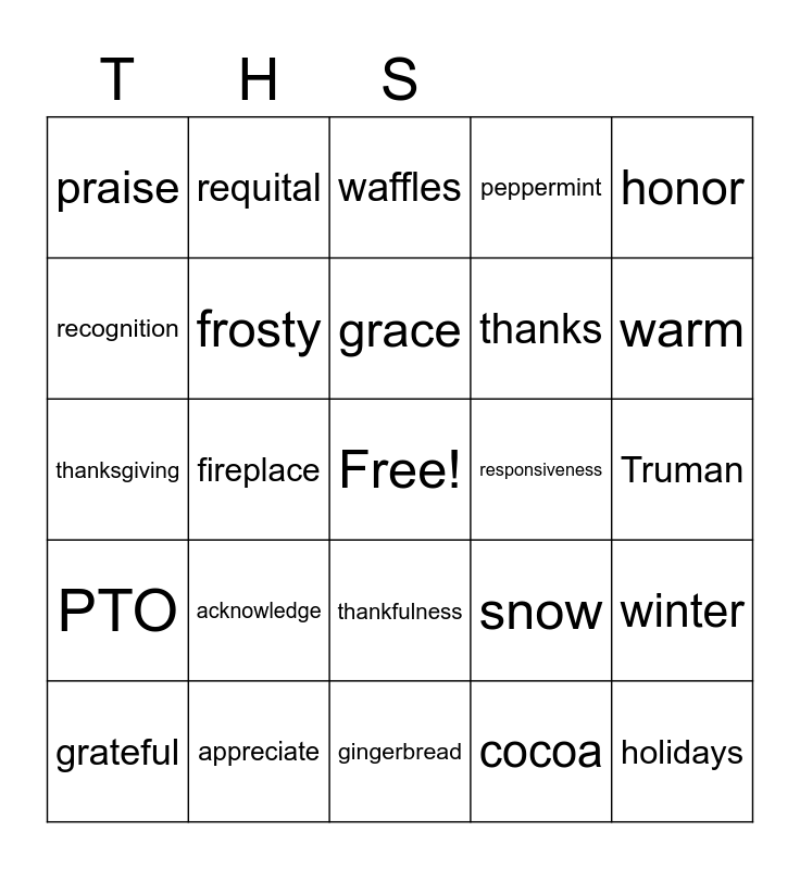 This bingo card has a free space and 24 words: acknowledge, appreciate, grace, grateful, honor, praise, recognition, requital, responsiveness, thankfulness, thanks, thanksgiving, snow, winter, frosty, cocoa, Truman, waffles, warm, fireplace, holidays, PTO, peppermint and gingerbread.