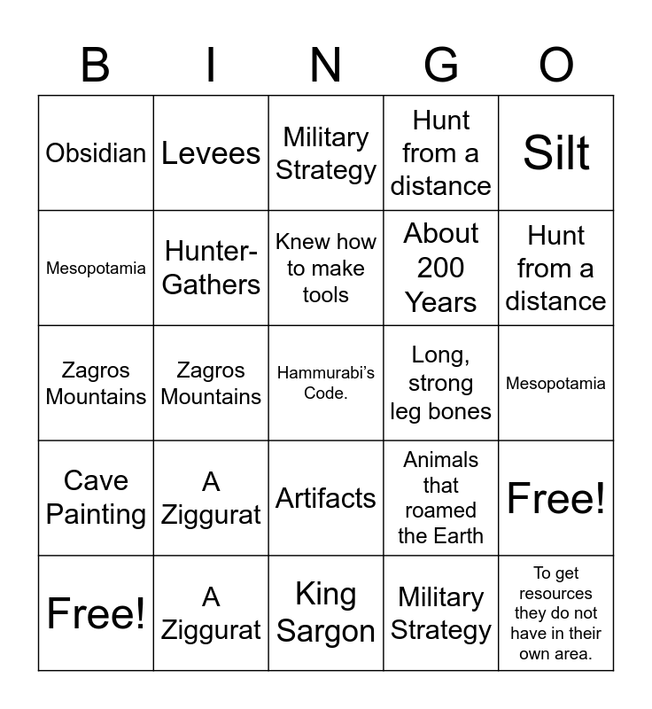 This bingo card has 49 words: Stone slabs that Akkadians used to carve great achievements, Hammurabi’s Code., The world's first empire, King Sargon, A Ziggurat, Scribes, Levees, Tigris and Euphrates River, Mesopotamia, Stable Food Supply, Hunter-Gathers, Hunt from a distance, Free!, Animals that roamed the Earth, Artifacts, Cave Painting, Knew how to make tools, Long, strong leg bones, To get resources they do not have in their own area., Silt, Zagros Mountains, Military Strategy, Obsidian, About 200 Years, High on the royal palace, Hunt from a distance, Free!, Animals that roamed the Earth, Artifacts, Cave Painting, Knew how to make tools, Stone slabs that Akkadians used to carve great achievements Hammurabi’s Code., The world's first empire, King Sargon, A Ziggurat, Scribes, Levees, Tigris and Euphrates River, Mesopotamia, Stable Food Supply, Hunter-Gathers, Long, strong leg bones, To get resources they do not have in their own area., Silt, Zagros Mountains, Military Strategy, Obsidian, About 200 Years and High on the royal palace..