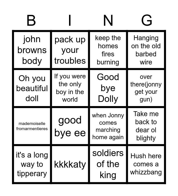This bingo card has 16 words: kkkkaty, Take me back to dear ol blighty, keep the homes fires burning, john browns body, mademoiselle fromarmentieres, pack up your troubles, when Jonny comes marching home again, soldiers of the king, Oh you beautiful doll, If you were the only boy in the world, it's a long way to tipperary, Hanging on the old barbed wire, good bye ee, over there(jonny get your gun), Good bye Dolly and Hush here comes a whizzbang.