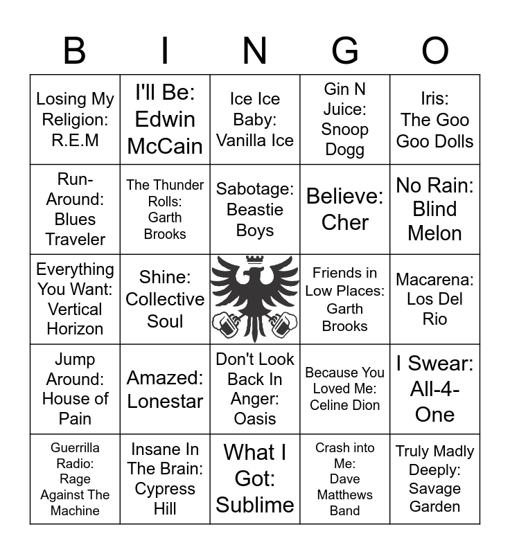 This bingo card has a free space and 104 words: Smells Like Teen Spirit: Nirvana, Barbie Girl: Aqua, Iris: The Goo Goo Dolls, What's Up?: 4 Non Blondes, Gansta's Paradise: Coolio, Enter Sandman: Metallica, Man In The Box: Alice In Chains, Under the Bridge: Red Hot Chili Peppers, Hypnotize: The Notorious B.I.G, All Star: Smash Mouth, Basket Case: Green Day, Mr. Jones: Counting Crows, Bills, Bills, Bills: Destiny's Child, Baby Got Back: Sir Mix-A-Lot, Just A Girl: No Doubt, Regulate: Warren G, Ice Ice Baby: Vanilla Ice, Good Riddance: Green Day, Smooth: Santana, I'm Gonna Be (500 Miles): The Proclaimers, Peaches: The Presidents of the United States, Shoop: Salt-n-Pepa, November Rain: Guns N' Roses, Loser: Beck, Freak on a Leash: Korn, Amazed: Lonestar, No Rain: Blind Melon, Gin N Juice: Snoop Dogg, 3AM: Matchbox Twenty, Killing Me Softly With His Song: Fugees, Because You Loved Me: Celine Dion, Crash into Me: Dave Matthews Band, It Was A Good Day: Ice Cube, Hold On: Wilson Phillips, Baby One More Time: Britney Spears, Kiss From A Rose: Seal, Poison: Bell Biv DeVoe, Waterfalls: TLC, Sabotage: Beastie Boys, Insane In The Brain: Cypress Hill, Semi-Charmed Life: Third Eye Blind, Jump Around: House of Pain, Bitter Sweet Symphony: The Verve, Run-Around: Blues Traveler, Gettin' Jiggy Wit It: Will Smith, Losing My Religion: R.E.M, (Everything I Do) I Do It For You: Bryan Adams, Truly Madly Deeply: Savage Garden, The Sign: Ace of Base, Only Wanna Be with You: Hootie And The Blowfish, Maria Maria: Santana, The Humpty Dance: Digital Underground, Give Me One Reason: Tracy Chapman, Spiderwebs: No Doubt, No Scrubs: TLC, Fly Away: Lenny Kravitz, Man! I Feel Like A Woman: Shania Twain, Achy Breaky Heart: Billy Ray Cyrus, The Crossroads: Bone Thugs-N-Harmony, Don't Look Back In Anger: Oasis, Macarena: Los Del Rio, Bye Bye Bye: *Nsync, Two Princes: Spin Doctors, One Week: Barenaked Ladies, If It Makes You Happy: Sheryl Crow, You Gotta Be: Des'ree, Ordinary World: Duran Duran, I'll Be: Edwin McCain, Everything You Want: Vertical Horizon, Shine: Collective Soul, What I Got: Sublime, U Can't Touch This: M.C. Hammer, Ninja Rap: Vanilla Ice, Vogue: Madonna, This Is How We Do It: Montell Jordan, Wait And Bleed: Slipknot, The Beautiful People: Marilyn Manson, Guerrilla Radio: Rage Against The Machine, Engine No. 9: Deftones, Boot Scootin' Boogie: Brooks & Dunn, I Like It, I Love It: Tim McGraw, She Thinks My Tractor's Sexy: Kenny Chesney, The Thunder Rolls: Garth Brooks, Sold: John Michael Montgomery, Friends in Low Places: Garth Brooks, This Kiss: Faith Hill, Larger Than Life: Backstreet Boys, Quit Playing Games (With My Heart): Backstreet Boys, I'll Make Love To You: Boyz II Men, Always Be My Baby: Mariah Carey, Friday I'm in Love: The Cure, No Diggity: Blackstreet, Black Hole Sun: Soundgarden, I Swear: All-4-One, Tootsee Roll: 69 Boyz, My Name Is: Eminem, Mambo No. 5: Lou Bega, Believe: Cher, Every Morning: Sugar Ray, You Make Me Wanna...: Usher, I'm The Only One: Melissa Etheridge, Crazy: Aerosmith, Boombastic: Shaggy and You Were Meant For Me: Jewel.