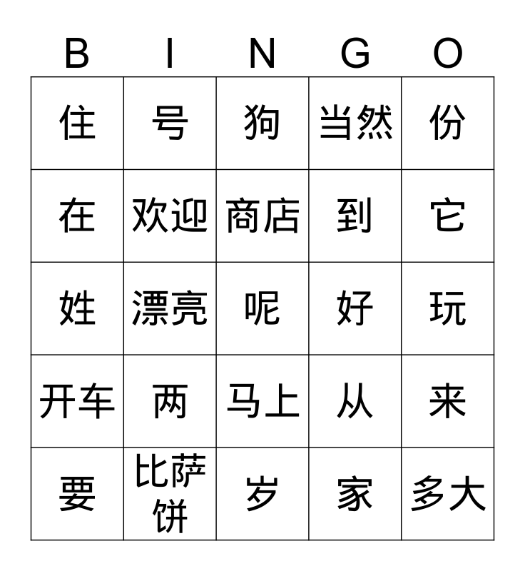 This bingo card has a free space and 24 words: 两, 比萨饼, 商店, 要, 份, 住, 在, 号, 好, 马上, 到, 姓, 从, 来, 欢迎, 家, 玩, 狗, 它, 漂亮, 多大, 开车, 当然 and 岁.