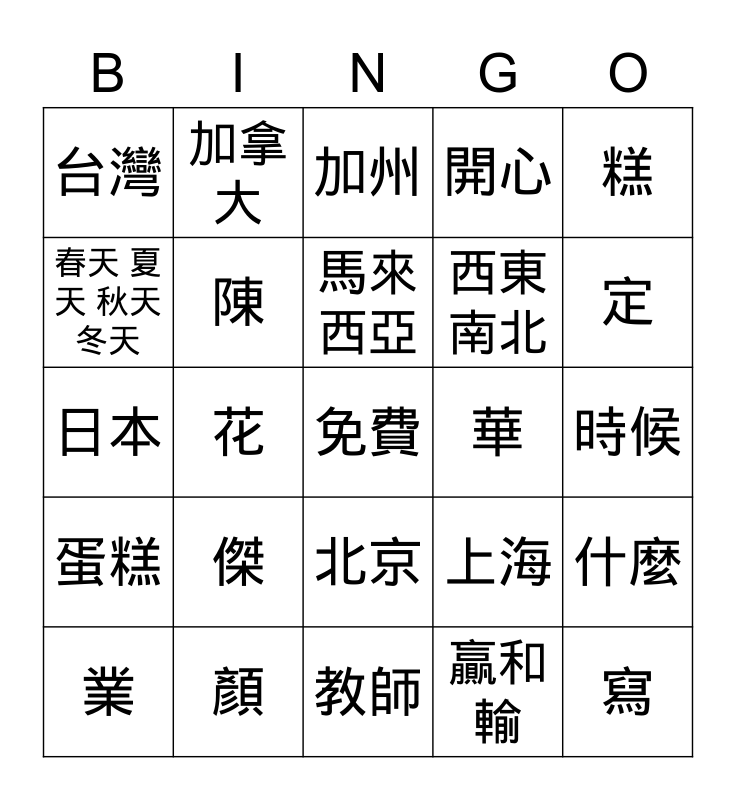 This bingo card has a free space and 29 words: 業, 財, 花, 中國, 台灣, 加州, 陳, 傑, 華, 顏, 時候, 寫, 教師, 贏和輸, 定, 原來, 北京, 蛋糕, 糕, 日本, 上海, 四季, 西東南北, 春天 夏天 秋天 冬天, 開心, 加拿大, 什麼, 馬來西亞 and 印度尼西亞.