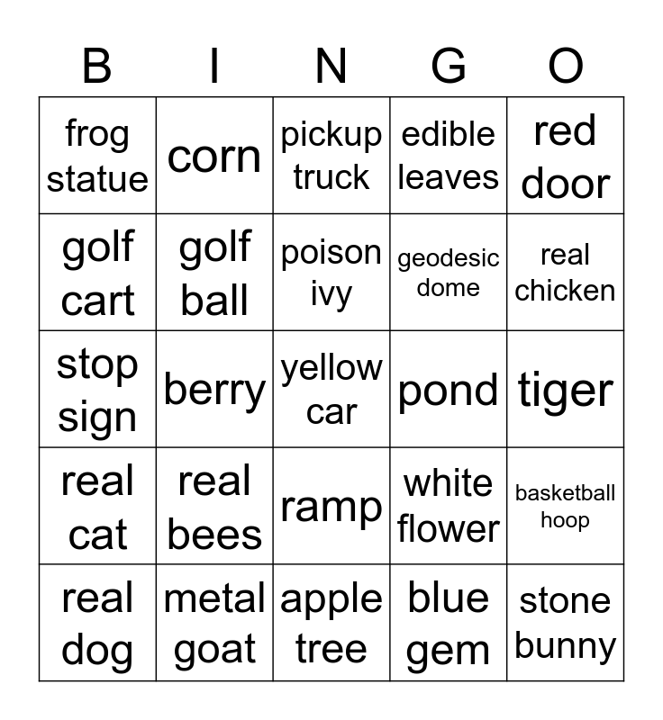 This bingo card has 33 words: stone bunny, rope swing, berry, canoe, real cat, golf ball, red door, real dog, corn, heart leaf, poison ivy, pickup truck, Free!, hammock, pond, real chicken, metal goat, stop sign, real bees, white flower, ramp, real squirrel, frog statue, tiger, apple tree, yellow car, edible leaves, geodesic dome, golf cart, basketball hoop, scooter, blue gem and common house.