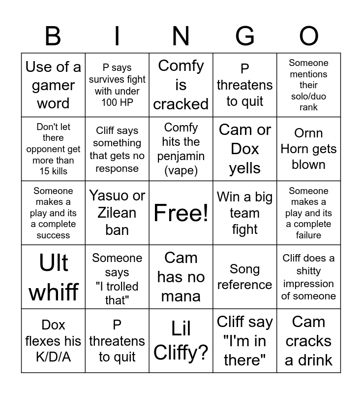 This bingo card has a free space and 24 words: Someone says "I trolled that", P threatens to quit, Comfy hits the penjamin (vape), Dox flexes his K/D/A, Someone mentions their solo/duo rank, Use of a gamer word, Don't let there opponent get more than 15 kills, P says survives fight with under 100 HP, Win a big team fight, Cam has no mana, Cam or Dox yells, Someone makes a play and its a complete success, Song reference, Cliff does a shitty impression of someone, Cliff says something that gets no response, Cliff say "I'm in there", Someone makes a play and its a complete failure, Comfy is cracked, Ornn Horn gets blown, Yasuo or Zilean ban, Cam cracks a drink, Ult whiff, P threatens to quit and Lil Cliffy?.