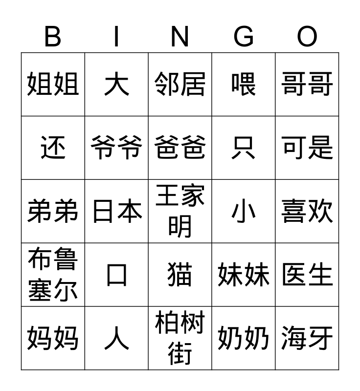 This bingo card has a free space and 24 words: 口, 人, 爸爸, 妈妈, 哥哥, 姐姐, 还, 大, 小, 猫, 只, 弟弟, 妹妹, 医生, 爷爷, 奶奶, 喜欢, 邻居, 可是, 日本, 海牙, 布鲁塞尔, 喂 and 柏树街.