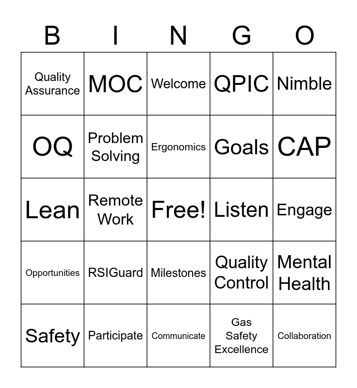 This bingo card has a free space and 24 words: Safety, RSIGuard, Ergonomics, Gas Safety Excellence, Nimble, Quality Assurance, MOC, Welcome, Listen, Engage, Lean, Problem Solving, Quality Control, Mental Health, OQ, Participate, Communicate, QPIC, CAP, Opportunities, Remote Work, Milestones, Goals and Collaboration.