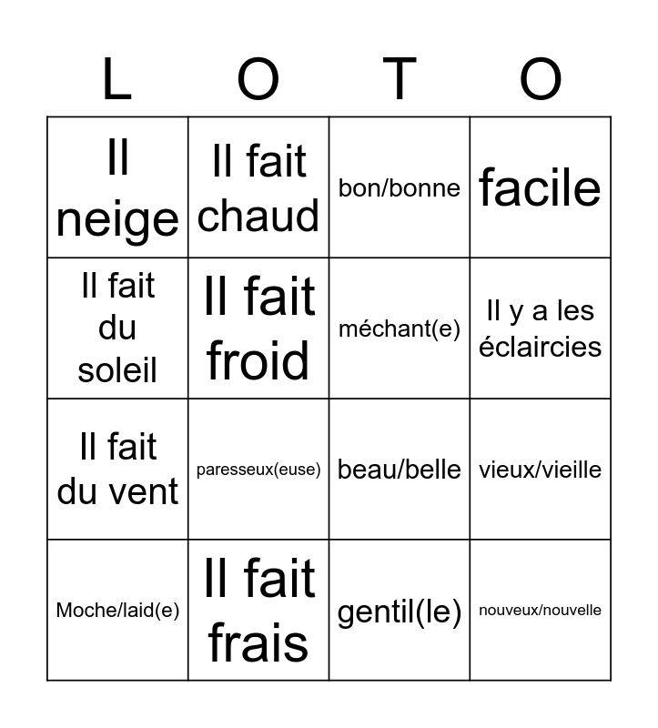 This bingo card has 25 words: Il y a les averses, Il y a les orages, Il y a les éclaircies, Il fait beau, Il fait du soleil, Il neige, Il fait froid, Il fait chaud, Il fait frais, Il fait mauvais, Il fait du vent, beau/belle, généreux/généreuse, créatif/créative, méchant(e), faché(e), gentil(le), bon/bonne, paresseux(euse), vieux/vieille, Moche/laid(e), marrant(e), nouveux/nouvelle, facile and difficile.