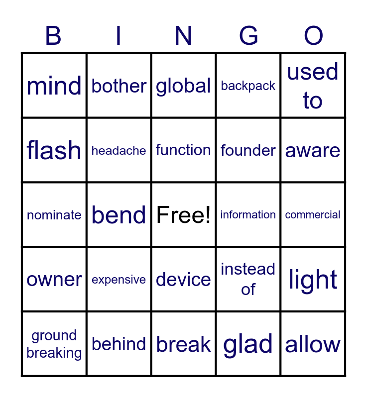 This bingo card has a free space and 47 words: attend, allow, available, break, expensive, careful, bother, concentrate, flash, swipe, headache, backpack, light, instead of, protective, search, function, information, cost, used to, bend, glad, mind, founder, company, aware, ground breaking, technological, device, owner, successful, jobless, remove, leadership, purchase, behind, commercial, employee, award, consider, release, global, nominate, numerous, length, include and billion.