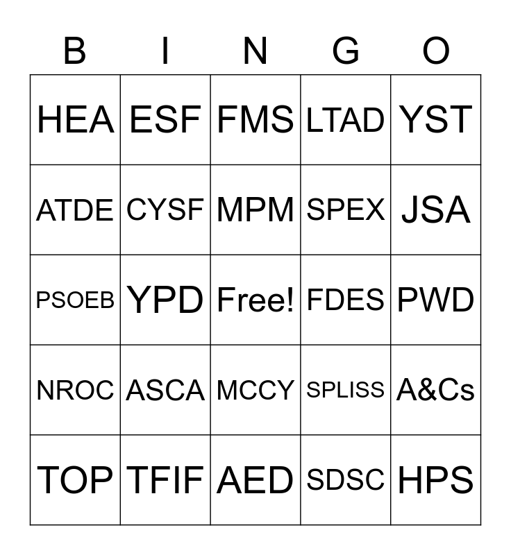 This bingo card has a free space and 24 words: ASCA, TFIF, MPM, TOP, YST, HEA, ATDE, ESF, FDES, MCCY, SPEX, PSOEB, SPLISS, A&Cs, CYSF, SDSC, PWD, FMS, JSA, YPD, HPS, NROC, LTAD and AED.