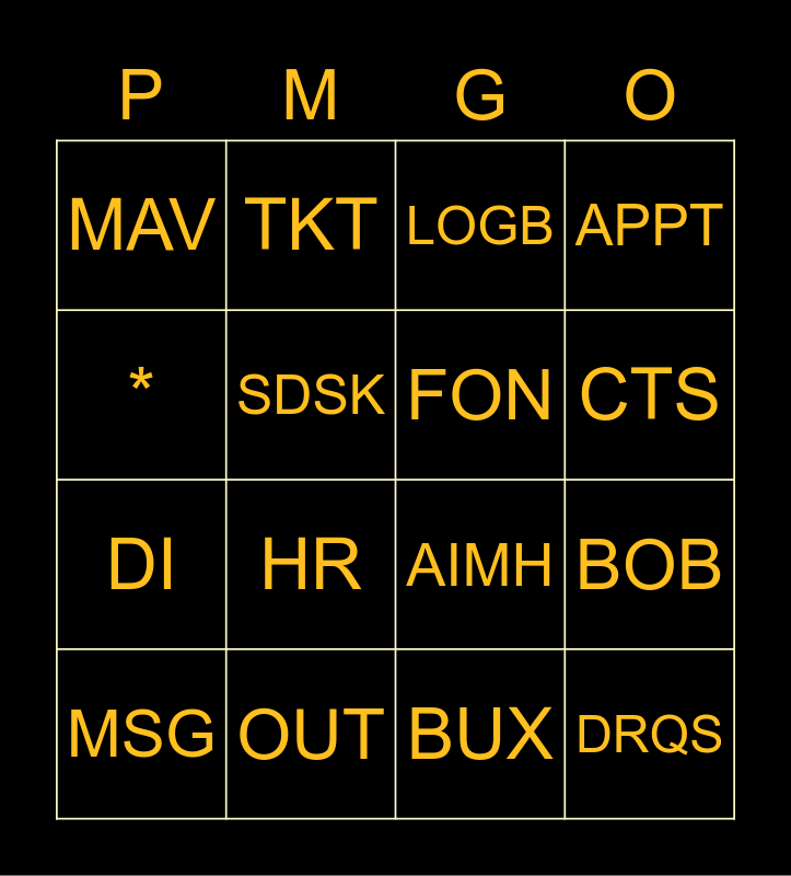 This bingo card has 39 words: CATS, FIRM, PATH, FON, SAIM, TENV, CTS, EREF, *, DRQS, BOB, APPT, MSG, BUX, OUT, NOTE, PM, MAV, ONCL, MOCA, SDSK, SECF, DI, HR, POLY, TNE, TEAM, SHOW, HIRE, TKT, EMSX, LOGA, LOGB, NEWS, OMX, AUDT, BBZM, AIMH and TC.