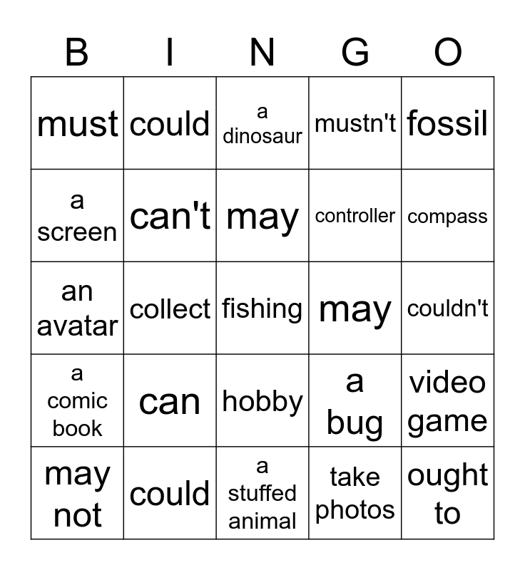 This bingo card has a free space and 24 words: can, could, may, may not, fossil, must, a screen, could, may, hobby, controller, an avatar, a bug, video game, can't, take photos, couldn't, a dinosaur, compass, collect, ought to, a comic book, mustn't and a stuffed animal.