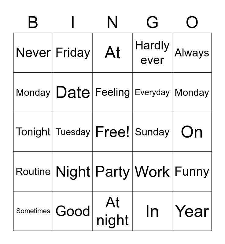 This bingo card has a free space and 24 words: Night, Good, Feeling, Sometimes, Always, Never, Monday, Friday, Sunday, Party, Everyday, Tonight, Work, Funny, Date, In, On, At, Monday, Tuesday, Year, Routine, Hardly ever and At night.
