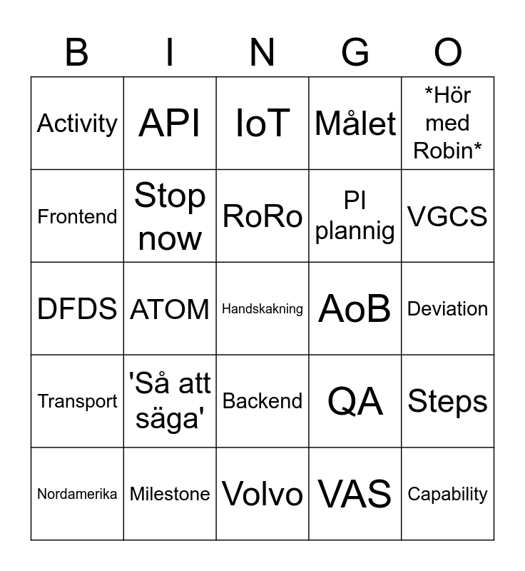 This bingo card has a free space and 24 words: 'Så att säga', Milestone, RoRo, Nordamerika, *Hör med Robin*, Activity, Frontend, API, AoB, Backend, PI plannig, DFDS, QA, Steps, Stop now, VAS, Deviation, IoT, VGCS, ATOM, Capability, Transport, Målet and Volvo.