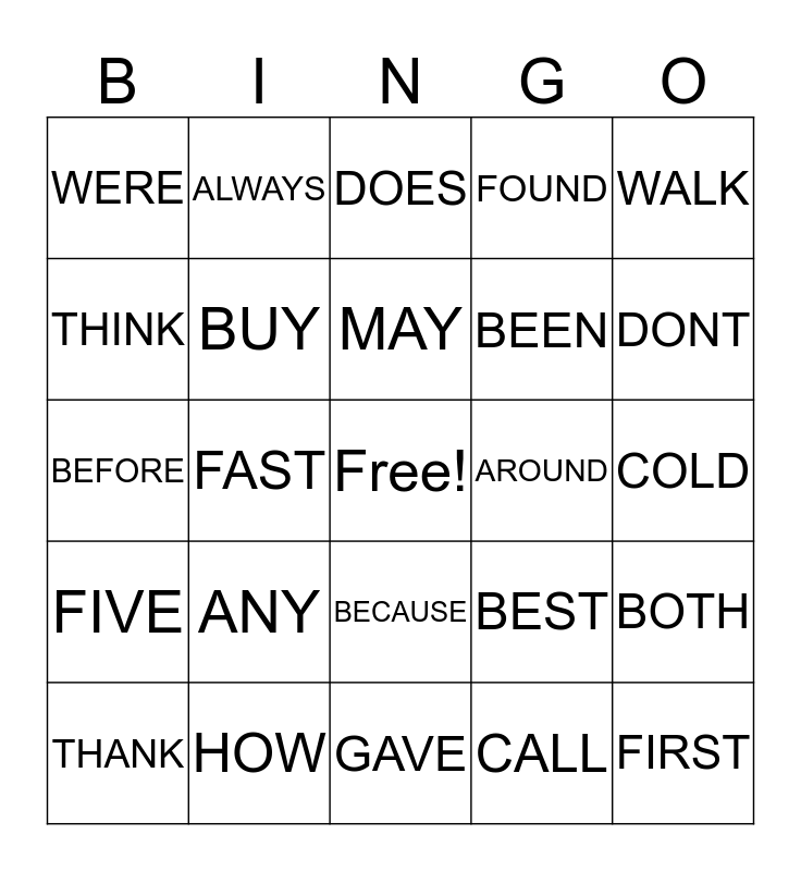 This bingo card has a free space and 24 words: ANY, HOW, MAY, THANK, WALK, WERE, THINK, ALWAYS, AROUND, BECAUSE, BEEN, BEFORE, BEST, BOTH, BUY, CALL, COLD, DOES, DONT, FAST, FIRST, FIVE, FOUND and GAVE.