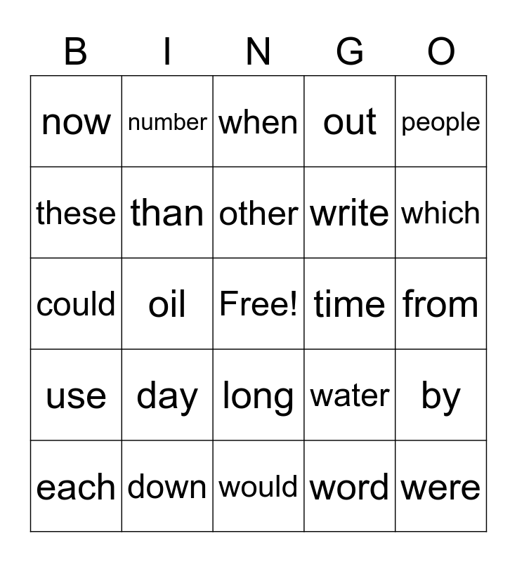 This bingo card has a free space and 24 words: day, down, other, each, people, now, these, number, time, long, write, could, water, by, than, word, from, when, which, oil, were, use, out and would.