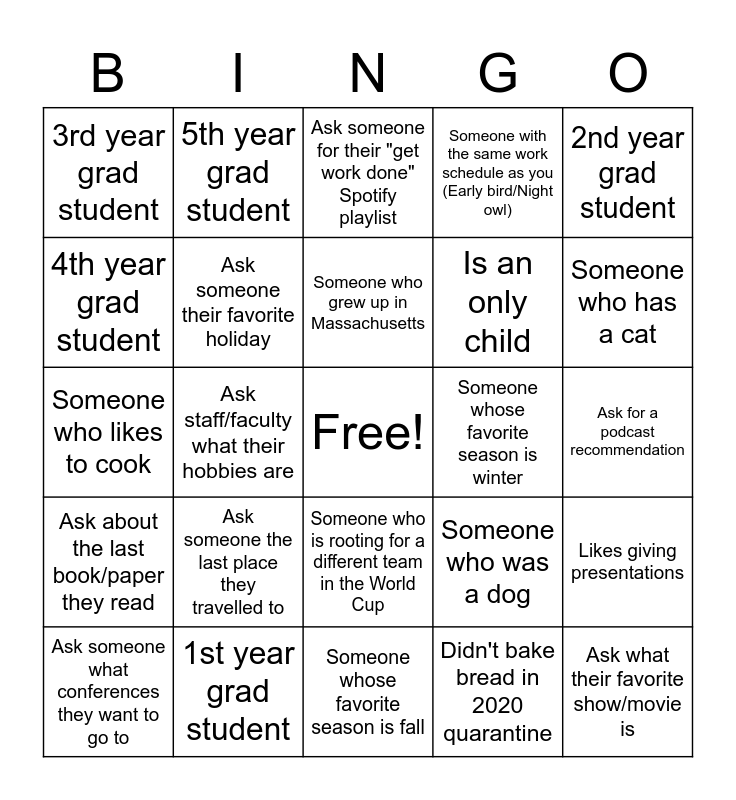 This bingo card has a free space and 26 words: Someone who is rooting for a different team in the World Cup, Didn't bake bread in 2020 quarantine, Someone who grew up in Massachusetts, 1st year grad student, 2nd year grad student, 3rd year grad student, 4th year grad student, 5th year grad student, Ask for a podcast recommendation, Someone who was a dog, Is an only child, Someone who likes to cook, Likes giving presentations, Ask someone what conferences they want to go to, Ask staff/faculty what their hobbies are, Ask someone for a restaurant recommendation, Someone with the same work schedule as you (Early bird/Night owl), Ask about the last book/paper they read, Ask someone for their "get work done" Spotify playlist, Ask what their favorite show/movie is, Someone who has a cat, Someone whose favorite season is fall, Someone whose favorite season is winter, Ask someone the last place they travelled to, Ask someone their favorite holiday and Someone who is not a sports fan.